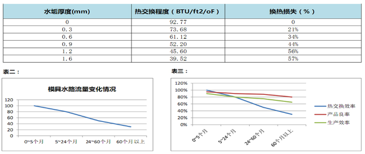 以注塑模具为例。在生产过程中,模具水道已采用了很长时间,冷热变化频繁,流过模具水道的冷却循环水中的钙和镁离子(Ca2+,Mg2+)继续晶体出来后,在管壁上也易于形成锈层。大量的水垢和铁锈黏附在管壁上,导致模具的水流减少,nz@变小,并且热交换效率降低,从而导致模制产品的质量不稳定。优质产品增加,生产效率降低!