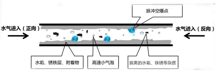 高速高压水蒸气混合技术用以将高压缩空气混合到高速水流中,并根据具体工况自动支配不同频率的物理气压脉冲,从而影响到空气的内壁。模具和其他小的水系统,形成空气爆裂。通过在两个方向上重复冲洗和振荡管道内壁,分开管道壁上的水垢和锈蚀,并同时除去管道附件和其他杂质时间。经过过滤和沉淀后,污垢通过排污口排出,以完成对水系统的清洁。